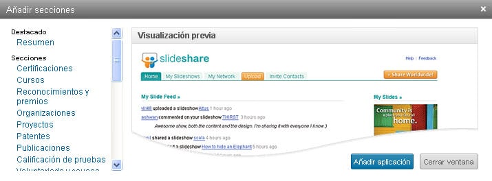 - El buscador de Linkedin, también entra en las Aplicaciones, con lo que si tienes Presentaciones en PowerPoint sería interesante que las hagas aparecer en tu Perfil a través de Aplicaciones como Slideshare y Box.net. Aparte, si tienes un blog, haz aparecer tus últimas publicaciones directamente en tu Perfil.
