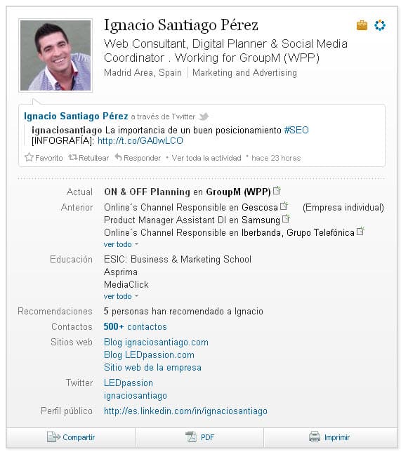 - La idea de que es necesario tener el Perfil completado al 100% para aparecer bien posicionado en las búsquedas, no tiene mucho sentido. De hecho, hacer búsquedas vosotros mismos y comprobad que muchos de los resultados de búsqueda no siempre tienen recomendaciones, foto, etc. No obstante, recomiendo completarlo al 100%.